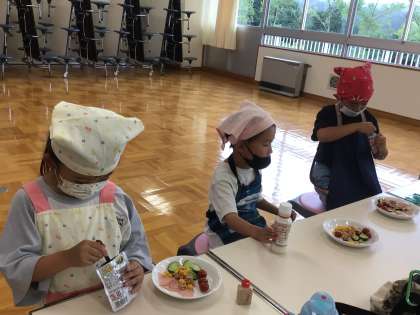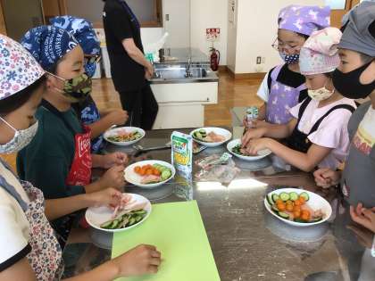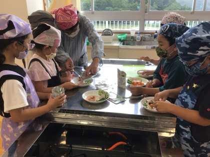 7月17日 野菜サラダ 公開日 2025/07/17 更新日 2025/07/17 各学年から 生活科で育てた夏野菜を使って、1、2年生がサラダを作りました。それぞれ、工夫して盛り付けていました。自分で育てた野菜は、おいしさもひとしおだったことでしょう。ドレッシング等のご準備ありがとうございました。