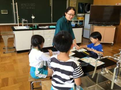 1年生は、理科室で実際に水の量を量りながら、算数「かさ」の学習に取り組んでいました。