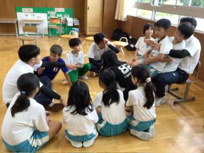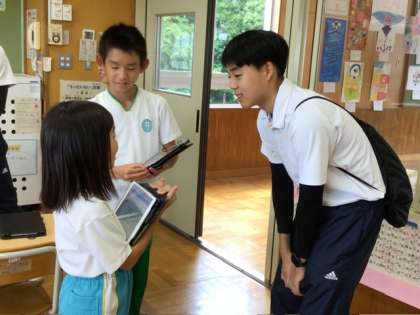 写真は、ニコニコタイムの子どもたちとの交流の様子です。みんなとても喜んで一緒に遊んでいました。2年生は午前中に作ったおもちゃで遊びました。5、6年生は「どうしてトヨタ学園に入ったんですか?」など、インタビュー活動をしていました。