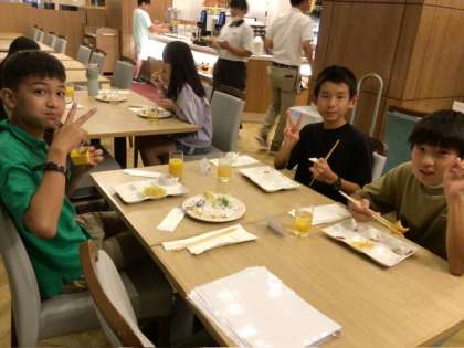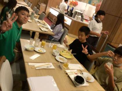 修学旅行6 公開日 2025/09/30 更新日 2025/09/30 各学年から ホテルでの夕食です。このときをみんな楽しみにしていました。バイキングで好きなものを楽しみながらも、終わりの時間を意識しているのはさすがです。お腹いっぱい食べていました。 このあとは、京都タワー展望台に上り、買い物タイムです。