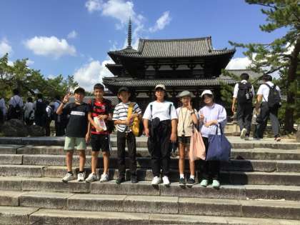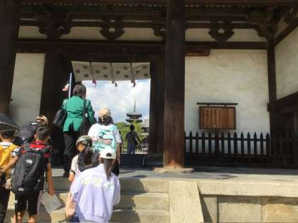 最後の見学地、法隆寺の中に入りました。南の門の前で写真を撮りました。