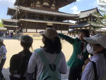 五重塔の前でガイドさんの説明をしっかり聞いています。