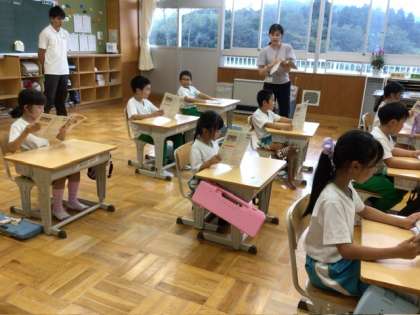 1、2年生は音楽です。教科書にある「ぷっかりくじら」を歌っていました。明るく元気な声で歌えたので、先生もほめてくださっていました。