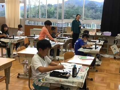 3、4年生は書写です。3年生は「小」、4年生は「らん」を毛筆で書きます。紙に向かって、真剣に筆を入れています。