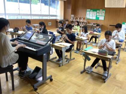 5、6年生は音楽です。2部に分かれてリコーダーで「魔法のすず」を演奏していました。きれいなリコーダーの音色です。5年生はキャンプが近づいてきました。「遠き山に日は落ちて」も練習していました。6年生は、いいお手本を見せられたでしょうか。