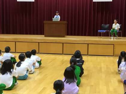 多目的ホールに集まって終業式を行いました。夏休みの作文などで優秀だった児童の表彰、児童代表の作文「前期に頑張ったこと」、校長先生のお話、校歌斉唱をしました。