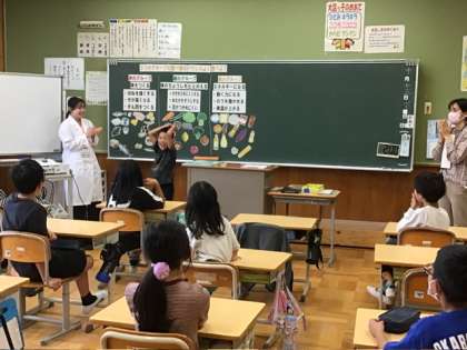 3、4年生は栄養教諭の先生に来校していただき、食育の授業を受けていました。写真は普段食べているものにどのような栄養があるのか、みんなで食材の絵を黒板に貼って確かめているところです。パーフェクト解答まで、もう少し!