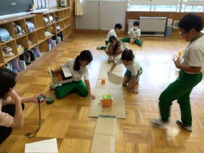 2年生は、工夫してきた手づくりのおもちゃを、いよいよ動かしています。写真は、あおいだ風を受けて手づくりの車がコースを走る様子です。