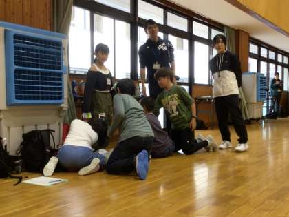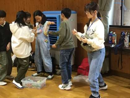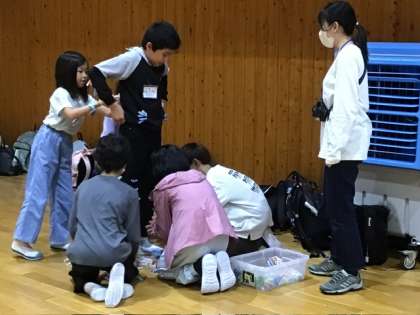 10月16日 キャンプちびっこギネス1 公開日 2025/10/16 更新日 2025/10/16 各学年から ちびっこギネスが始まりました。 班で協力して、1分間にどれだけ洗濯バサミをつけられるか(つけるところは肌ではなく服や靴などに限定)を競争しています。