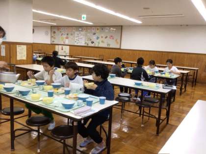 10月17日 キャンプ朝食 公開日 2025/10/17 更新日 2025/10/17 各学年から どんぐり食堂で朝ごはんです。 昨日のカレーライスはすっかりこなれ、おいしく朝ごはんをいただいています。 眠そうな顔もちらほら…