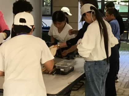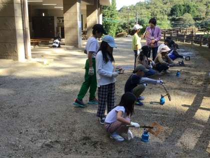 10月17日 キャンプクラフト2 公開日 2025/10/17 更新日 2025/10/17 各学年から 木枠をバーナーであぶって黒くし、磨いて艶を出します。紐通しを作って紐を通したら、好きな絵を描いて仕上げます。学校の枠を超えて、友達と一緒に作ったり見せ合ったりしています。