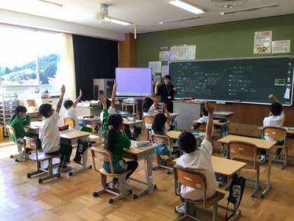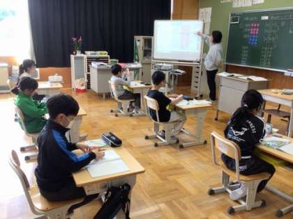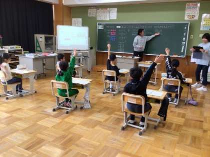 3、4年生の理科の様子です。太陽に当たると自分の影ができる、その影について知っていることを発表しようと多くの子が手を挙げています。2年生の算数でも、負けずに手がピンピンに挙がっています。今日はかけ算の3の段を使って問題を解きました。問題を解いた後、3の段の九九カードを使って確認していました。