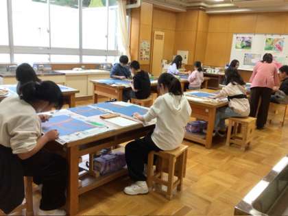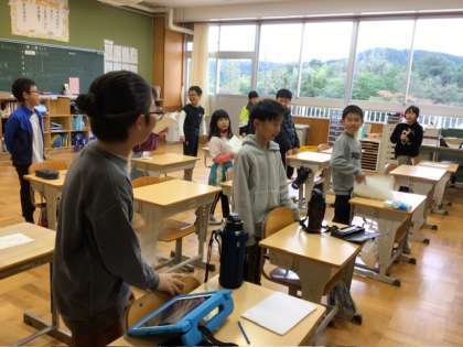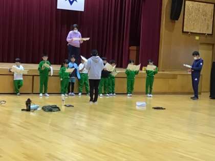 11月5日 授業の様子 公開日 2025/11/06 更新日 2025/11/06 各学年から 各学年では、学芸会の練習が始まりました。 ホールで読み合わせをする1、2年生、劇の中に出てくる歌の練習をする3、4年生。何度も練習するうちに覚えていきます。 5、6年生は図工で、読書感想画を描いていました。「自分だけのくすのきをかこう」というめあてです。紺色の色画用紙にクレヨンでいろいろな色を使い、木の幹を描いていました。