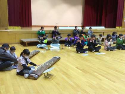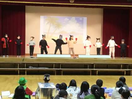 雅楽や劇を緊張の中で練習を思い出して頑張りました。感染症予防のため、劇ではマスクをつけて演技しました。