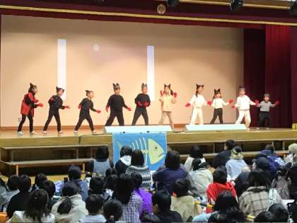 ニャー!というかけ声もかわいらしい1、2年生の演技でした。途中、とんでしまったセリフやラーメン体操を、最後に改めて会場の皆さんに見ていただけてよかったです。