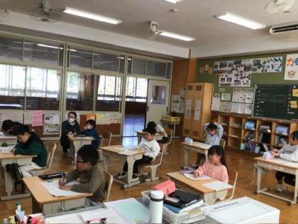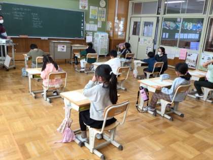 1、2年生は水曜日に近くのパン屋さんへ見学とインタビューに行きます。持ち物などを確認していました。食べ物を扱うお店に行きますので、マスクを忘れないように…と先生からお話がありました。