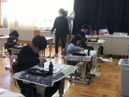 5、6年生の書き初め練習の様子です。豊田書道連盟からのボランティアさんが指導してくださり、子どもたちの筆をもつ手も真剣です。「線がきれいだね」「『豊』の上の部分、つぶれずに上手に書けているね」など、たくさんのほめ言葉をもらいながら頑張っていました。