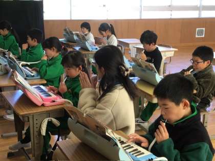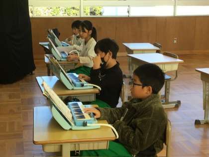 12月16日 授業の様子 公開日 2025/12/16 更新日 2025/12/16 各学年から 1、2年生の音楽の様子です。 鍵盤ハーモニカを使い、ドレミファソの5つの音を正しい指づかいで演奏する練習です。やっていた曲は「こぎつね」でした。みんな上手に演奏していました。