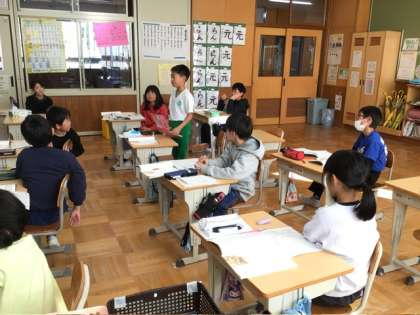 3、4年生の教室で国語科「ごんぎつね」の授業をしています。ごんや兵十、人物の気持ちの変化を読み取る内容です。