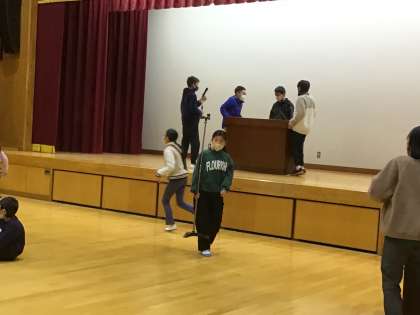 集会が終わったら、5、6年生の子どもたちがダッシュで舞台上の演台や舞台下の大型テレビに駆け寄り、片づけを進めてくれました。自分で考えてやれることをやっている姿、高学年らしいです。