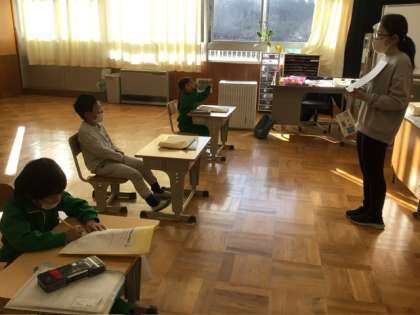 冬休み前ということで、1年生は冬休みの生活のカードを配ってもらい、冬休みにやるといいことの説明を聞いていました。「やりたいところを、やりたい回数だけやっていいよ」と渡された音読のテキスト、どれくらい読めるでしょうか。
