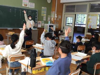 3、4年生は国語の授業です。ペアで意見を出した後は、やはり全体の前でも自信をもって挙手ができています。