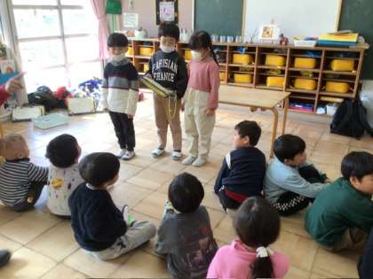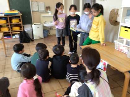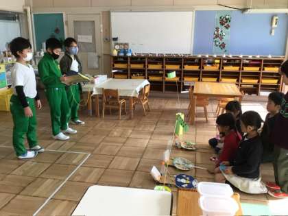 1月16日 1、2年生生活科学習 公開日 2026/01/16 更新日 2026/01/16 各学年から 1、2年生が生活科で作ったおもちゃを持って、こども園を訪問しました。園の子どもたちにおもちゃの遊び方を説明して、実際に遊んでもらいました。お兄さん、お姉さんらしい姿が見られました。