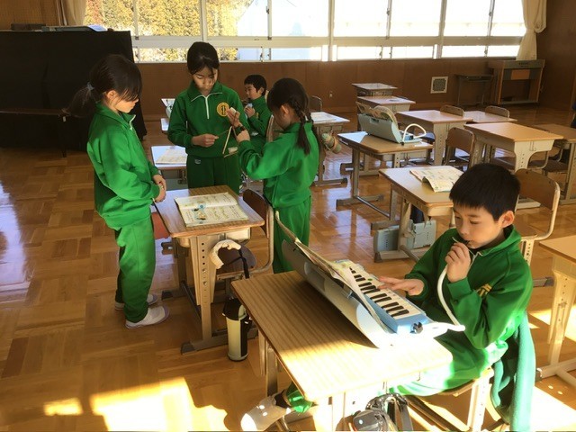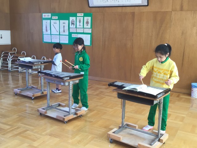2月3日 授業の様子 公開日 2026/02/03 更新日 2026/02/03 各学年から 1、2年生の音楽では、「こいぬのマーチ」をみんなで合奏しようと楽器を割り振って練習していました。みんなそれぞれの受け持ちの楽器を一生懸命練習していました。
