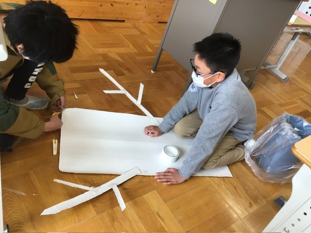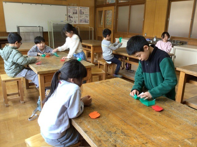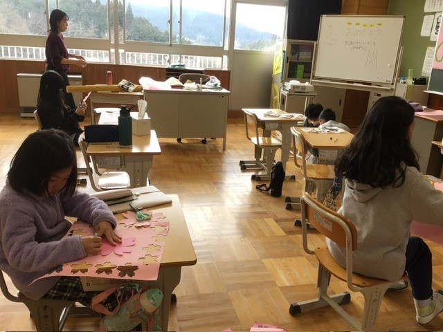 明日は学級じまいの日です。3、4年生は最後にみんなでレクリエーションの王様ドッジをしていました。1、2年生は図工の時間に入学式で使う飾りを作っていました。5年生も同じく、入学式の飾りを作っていました。