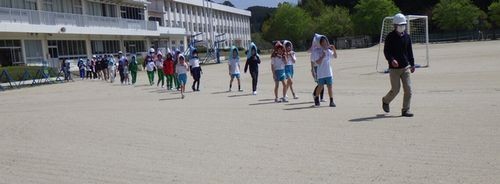 3時間目に避難訓練を行いました。「授業中に地震による強い揺れが発生」という想定です。どの子も防災頭巾をかぶり、静かに安全に避難することができました。担当教師から『いつでも どこでも だれとでも』避難できるようになろうと話がありました。地震は起きないほうがよいですが、もしものときに自分の命は自分で守れる子どもたちであってほしいと願います。