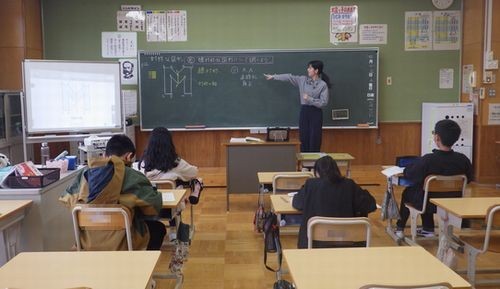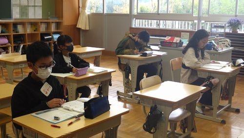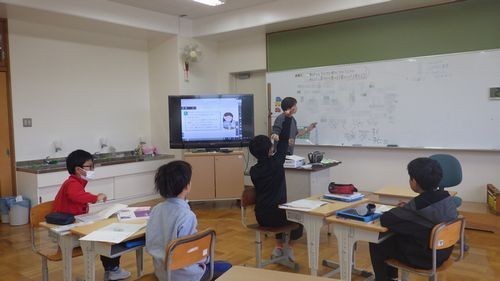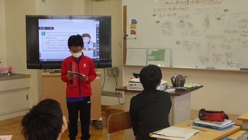算数の授業は、5年生と6年生が別々の教室で行っています。5年生は『小数のたし算やひき算のしかたを考えよう』、6年生は『線対称な図形について調べよう』というめあてで取り組みました。5年生の振り返りでは、友だちの発表から自分の考えを広げることができた様子が伝えられました。