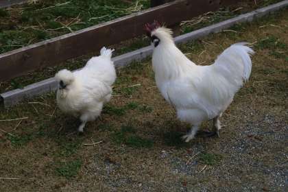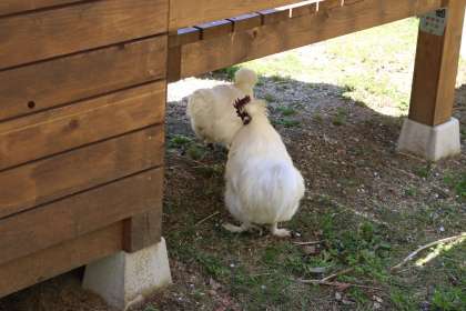 ウコッケイは、6歳になるクッキー(オス)とチョコ(メス)がいます。高齢で、卵を産む数も最近減ってきました。日差しを避けたい時は、ヤギ小屋の床下で、過ごします。