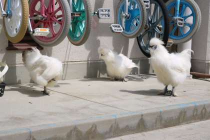 新入り6カ月のウコッケイのミント(オス)、キラリ・キララ(メス)がデビューしました。この3羽は、昨年度の学芸会後のバザー会場で募金を募り、購入しました。1月からは、寒いので校舎内で飼育していましたが、4月からは本格的に外の飼育舎で飼育することになり、興味津々で校舎近くを散歩しています。