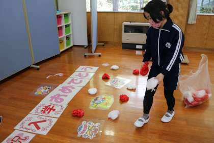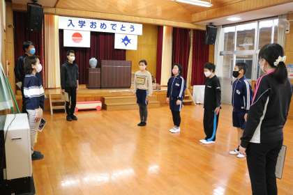 入学式と始業式に向けて、新5・6年生の13名が登校して準備しました。式場は、机やイスの設置、背面の掲示物など準備をしました。