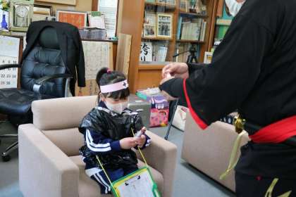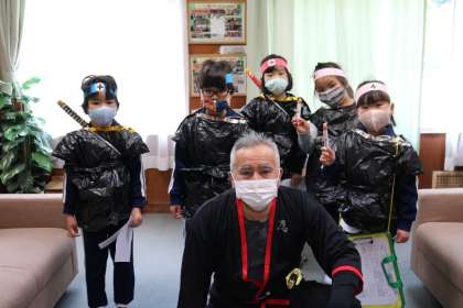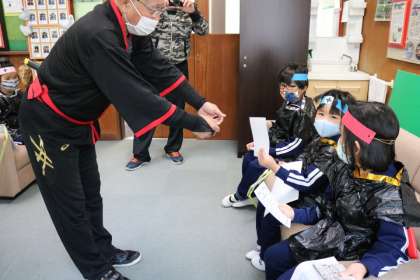1・2年・ひまわり学級 生活科「学校探検をしよう」 〜忍者になって学校内を探検3〜 4月20日(火) 公開日 2021/04/25 更新日 2021/04/25 校長室から 元気よく、いっぱい質問ができたので、忍者学園長から1年生には免許皆伝巻物、2年生には、忍者の頭領認定書が手渡されました。 元気よく『にん!』という言葉と退出のあいさつをしっかりして、校長室を後にしました。次は、どこへ・・・。
