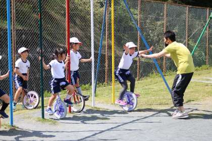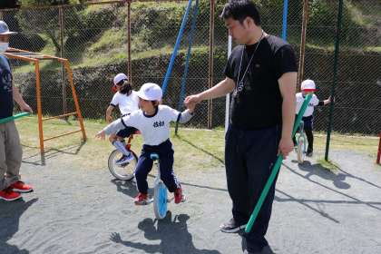 なかよしタイム 〜学習支援員さんによる一輪車の補助支援〜 4月22日(木) 公開日 2021/04/25 更新日 2021/04/25 校長室から 昨年度は、コロナ禍で低学年で練習時間が充分確保できず、助けていただきました。今年度も、体育学習後のなかよしタイム(放課)の時間に、学習支援員さんが一輪車の補助支援をしてくださいました。 少しでもペダルを漕いで、遠くへ進みたい、乗れるようになりたいと強く願う子ども達は、がんばって練習します。とてもありがたいことです。