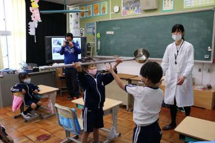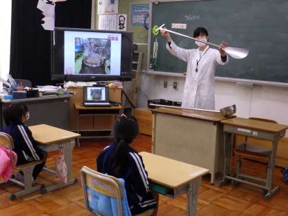 調理や食器の片付けまで、センターで働く方々の映像を観ながら、知らないことを教えていただきました。1回に何人分のおかずを調理しているかとか、普段見かけない大きな調理器具の使い方などがクイズで出題され、1年生5名は楽しく答えていました。