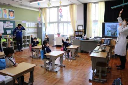 栄養教諭のS先生をお招きして、1年生の「食に関する指導」が、4時間目に行われました。自分たちが食べている給食が、足助給食センターから学校に届くまでに、たくさんの方々が関わって届けられていることを学習しました。