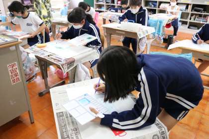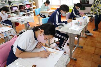 5・6年生が、水彩絵の具を使って、表したい表現(色や形、構成の美しさ)を考えて作品作りをしました。