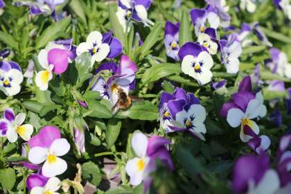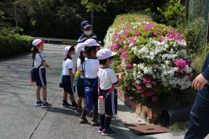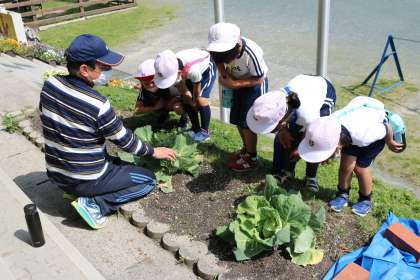 野菜の葉の裏やツツジの木を観察しながら、花の周りを飛んで蜜を集める蜂などの観察をしました。