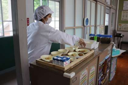 N養護教諭と公務手さんが、給食を食器に配膳してくださいます。1年生は、1階教室前のワゴンに、2階の5・6年生は、ランチルームに各自取りに行きます。