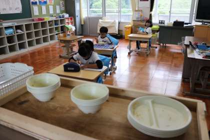 会食後、2年生の食器類は、箱にまとめられ先生が、5・6年生は子ども達がランチルーム前に片付けに行きます。