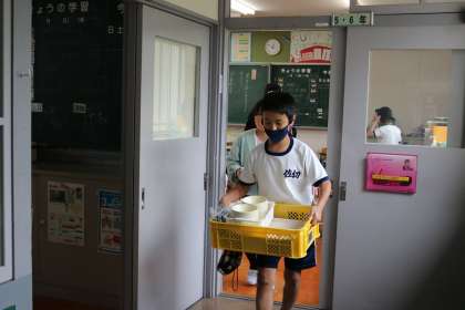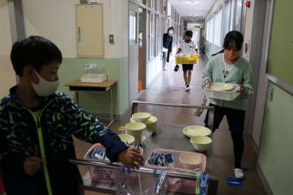 緊急事態宣言」を受け、今日からコロナ感染症防止対策の給食配膳・会食・片付けに変更しました! 〜2年生の食器類は先生が、5・6年生はまとめた食器類をランチルームまで持っていきます〜 5月12日(水)