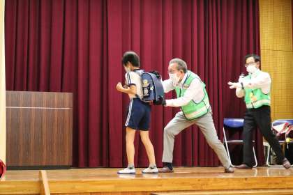本来ならば、全校児童が、大声で「助けて〜」と叫ぶ練習と手をつかまれた時の対処訓練を行うところですが、コロナ感染防止のため実演していただくだけとなりました。