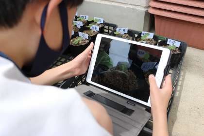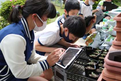 5・6年生が、昼放課に学習用タブレットを活用して、ジャンボひまわりの観察をしていました。自分の苗の写真を撮り、観察で気づいたことや感想をタブレットでまとめていました。