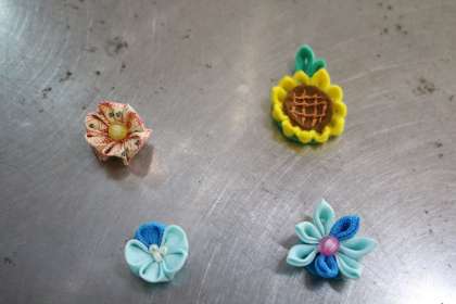 「つまみ細工」講座について紹介します。各自用意した様々な色や柄やデザインの布(3cm四方)を用意し、布の角にボンドを少しつけ、布をつまんで折り込んで1枚の立体的な花びらのような形を作っていきます。その立体を放射状に並べて、フェルトに貼り付けると立体的な花びらのある色鮮やかな花が完成します。