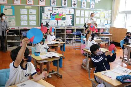 市の道徳科指導員のO先生にご来校いただき、3・4年担任のH先生が、題材「まどガラスと魚」の授業を行いました。