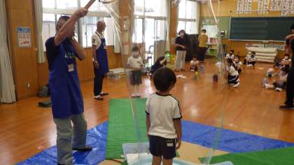 運動場でシャボン玉遊びをした後に、ジャンボシャボン玉体験を集会室でしました。子どもたちの身体全体を、虹色のバリアーで包み込まれる体験に歓声があがりました。