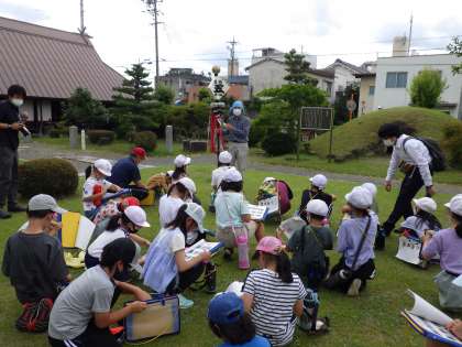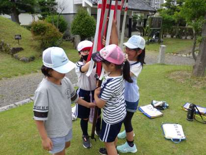 昼食後、郷土資料館で学習しました。資料館内の中庭で、「火事から暮らしを守る」昔の道具や生活の様子を、道具に触ったり、学芸員の方のお話を聞いたりしました。