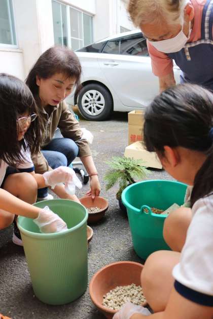 ご自宅近くの山から、盆栽に適した樹木枝、苔、植物を採取され、小石の軽石、赤土と盆栽用の発鉢までも準備いただきました。4名が受講する予定でしたが、2名が欠席で担当の中根先生と校長先生も参加しました。子どもたちの感性は素晴らしく、思い思いの植物を選んだら、レイアウトを考えながら夢中で、楽しそうに活動しました。